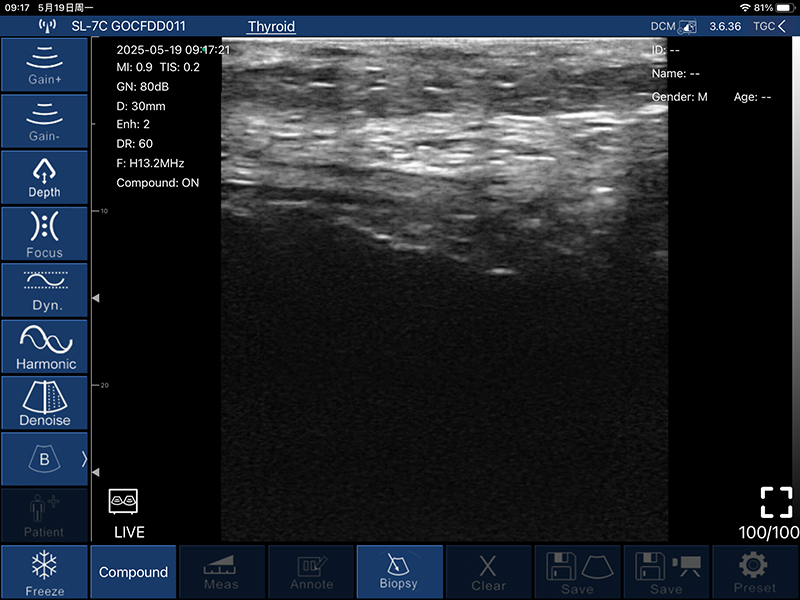 • 穿刺辅助功能:平面内穿刺引导线功能,平面外穿刺引导与血管自动测量功能