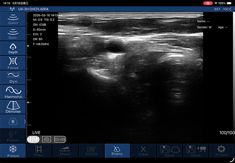 • 探头频率:6.5MHz/8MHz,线阵腔内二种模式,长按开关键切换